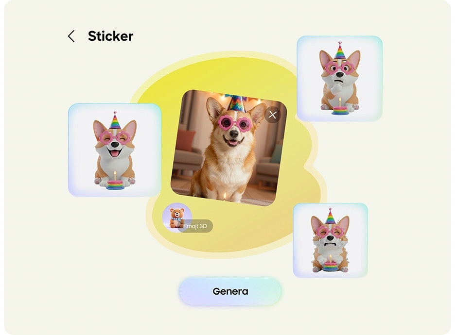 Apri Creative Studio e scopri uno spazio dedicato alla creazione di set di sticker. Fai un mix di schizzi, foto e testi per descrivere la tua idea, e Galaxy AI realizzerà le tue creazioni. Poi, aggiungi il set di sticker alla tastiera o condividilo con i tuoi amici.12