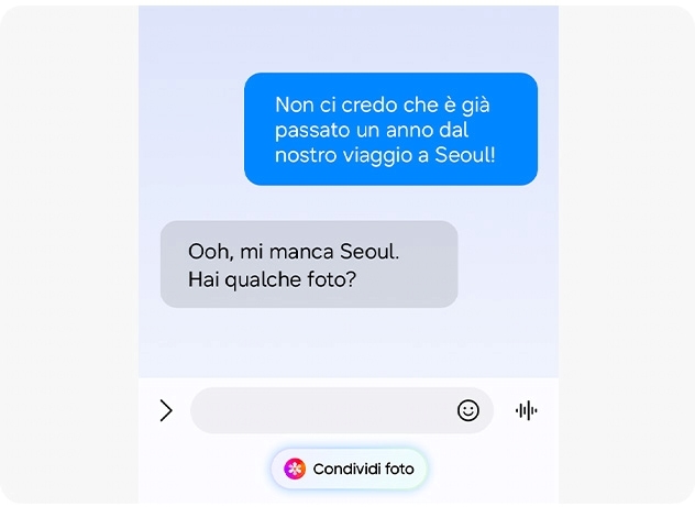 Grazie a Galaxy AI, il nuovissimo Now Nudge è in grado di capire il contesto sullo schermo e consigliarti cosa fare: riduce al minimo i passaggi necessari, e ti dà anche suggerimenti di compilazione automatica. Ad esempio, se qualcuno ti chiede le foto di un viaggio che hai fatto, Now Nudge capirà cosa ti serve e ti manderà al punto giusto della Galleria, così potrai selezionare e inviare le foto in pochi tocchi.13