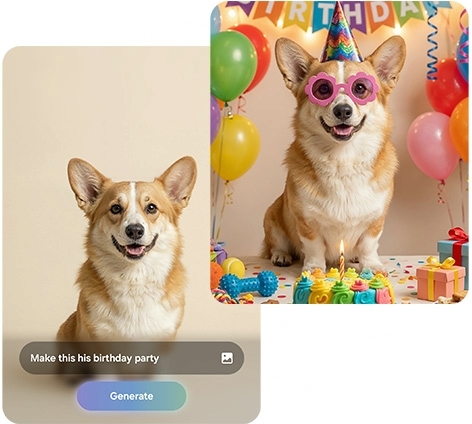 Ottieni un editing fotografico facile e veloce con l’utilizzo di poche parole e dell'AI. Aggiungi oggetti, come degli accessori, alle foto del tuo animale domestico: descrivi in modo naturale le modifiche che desideri apportare e Galaxy AI realizzerà la tua idea in pochi minuti.3
